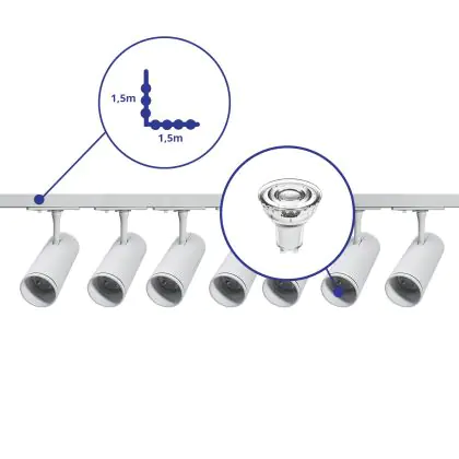 Description Ensemble complet Rail Monophasé Rail L 1,5 x 1,5 Mètre Blanc | incl. 7x Spot + GU10 2700K 3W Dimmable + Embout, Connecteur d’Alimentation et L -Connecteur