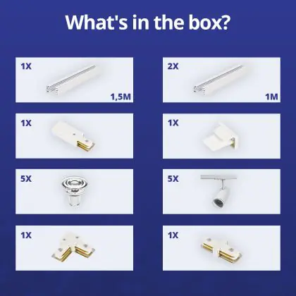 | Nom du fabricant | Complete L shaped 1-Phase Track Set White incl. 5x Spot fixture + GU10 2700K 3W Dim – 1,5 x 2 meter | |