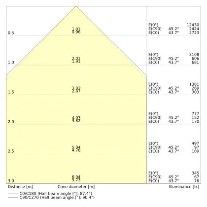 Le code couleur se compose de l'indice de rendu des couleurs (IRC) et de la température de couleur (Kelvin). Le premier chiffre indique le rendu des couleurs (1 = très mauvais rendu des couleurs, 9 = meilleure authenticité des couleurs). Le deuxième et troisième chiffre indiquent la température de la couleur. Exemple : Le code couleur "830" indique que la lampe a un bon rendu des couleurs (8) et une couleur de lumière blanche chaude (30 = 3000K). |