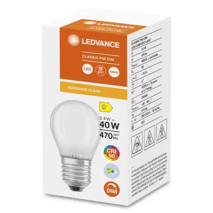 Cette ampoule Ledvance Superior Classic LED E27 Boule Dépolie 3.4W 470lm - 940 | Dimmable - Meilleur rendu de couleur est l’alternative idéale pour la remplacement de votre ampoule classique de 40 W. La technologie LED intégrée vous offrira de nombreux avantages. Les ampoules à incandescence traditionnelles ont une durée de vie limitée. Cette alternative LED vous permettra de profiter d’un éclairage durable et fiable.