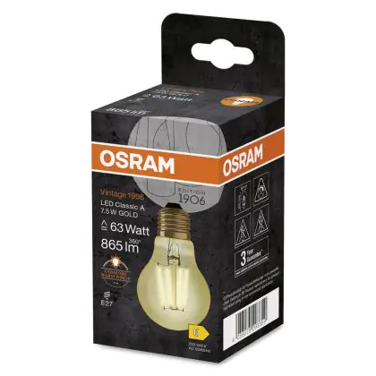 Cette ampoule Osram Vintage 1906 LED E27 Poire Filament Dorée 7.5W 865lm - 825 Blanc Très Chaud | Remplacement 60W avec son efficacité lumineuse de lumen par watt vous permettra de profiter d’un éclairage de qualité. Avec sa durée de vie de 15000 heures, vous n’aurez pas à vous soucier de son remplacement avant quelques années.