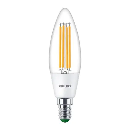 Cette ampoule Philips MASTER LED Bougie E14 Filament Claire 2.3W 485lm - 830 Blanc Chaud | Équivalent 40W avec son efficacité lumineuse de lumen par watt vous permettra de profiter d’un éclairage de qualité. Avec sa durée de vie de 50000 heures, vous n’aurez pas à vous soucier de son remplacement avant quelques années.